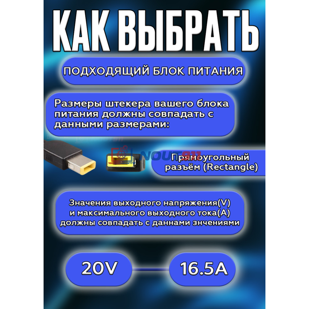 Теперь ваш ноутбук всегда будет готов к любым задачам, независимо от вашего местоположения. Доверяйте качеству и выбирайте Lenovo 20V 16.5A 330W для надежной и долгосрочной работы вашего ноутбука!