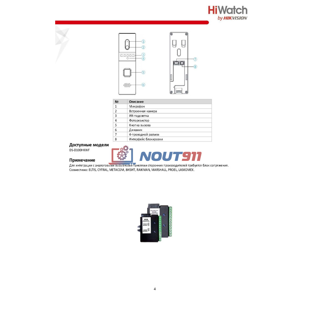 - Количество подключаемых вызывных панелей: 1