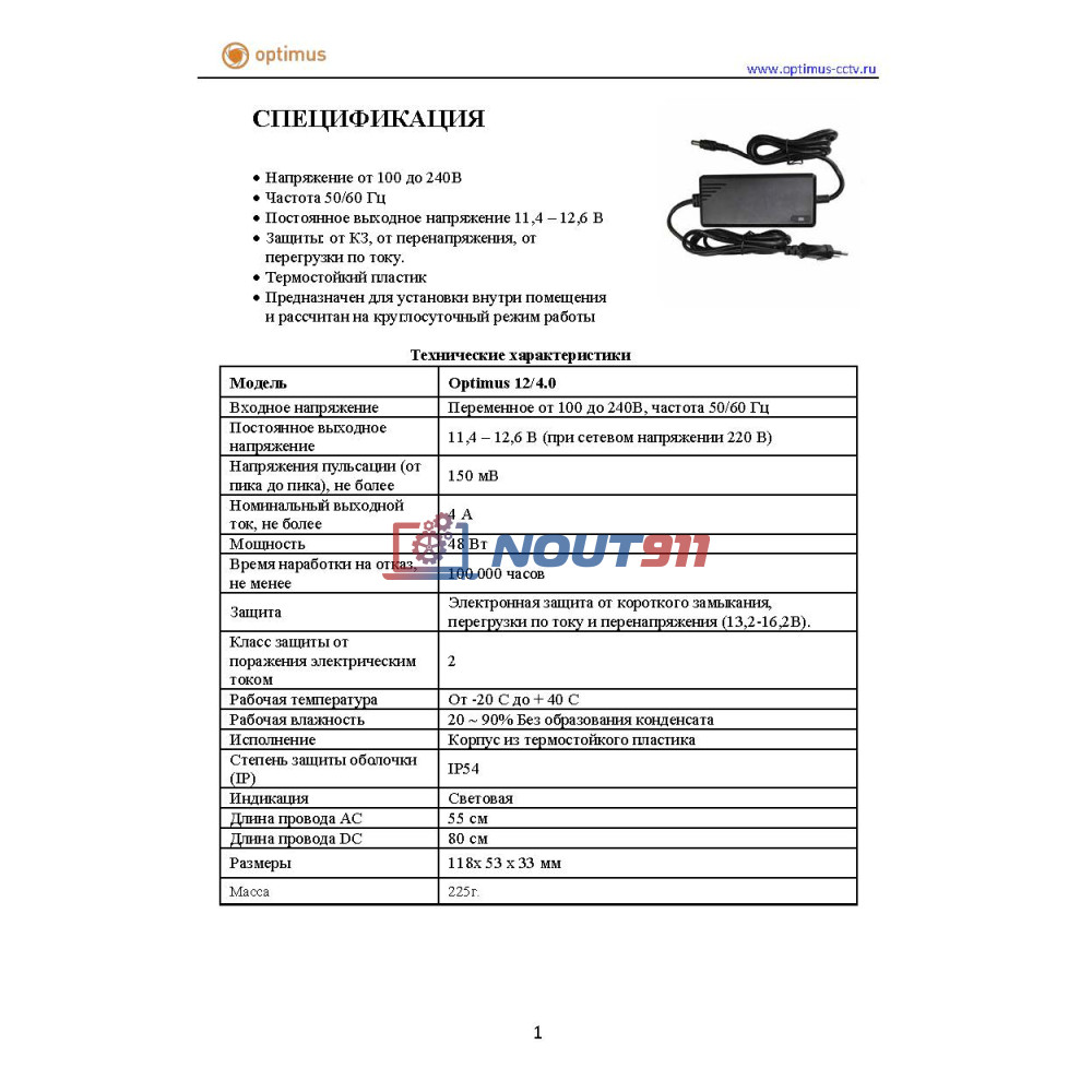 - Блок питания Optimus 12/4.0: 1 шт.