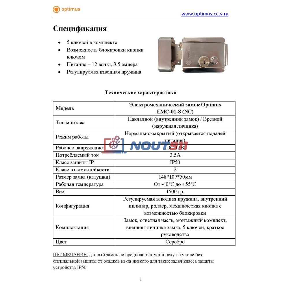 - Электромеханический замок Optimus EMC-01-S (NC): 1 шт.