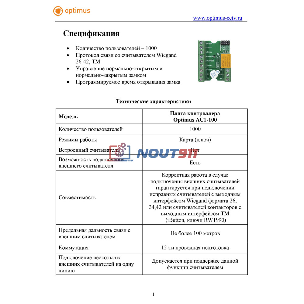 - Плата контроллера Optimus AC1-100: 1 шт.