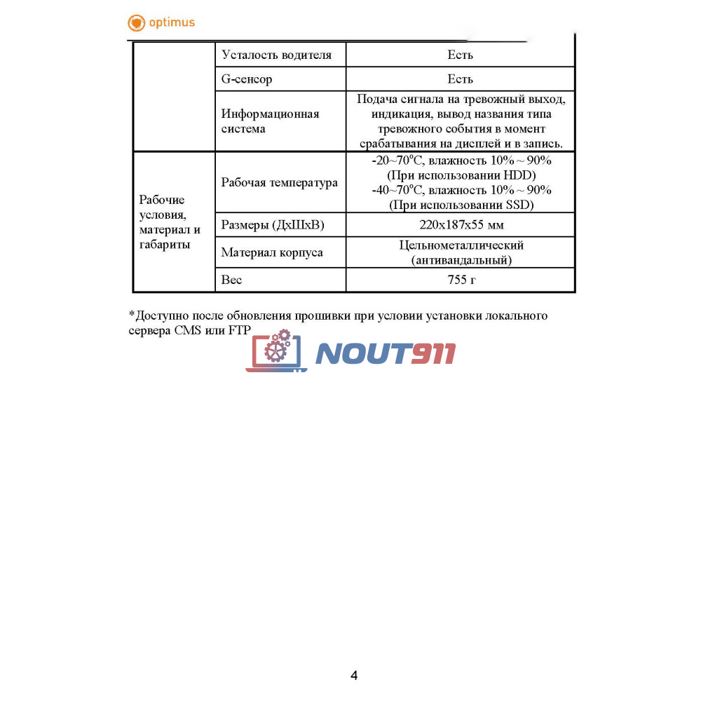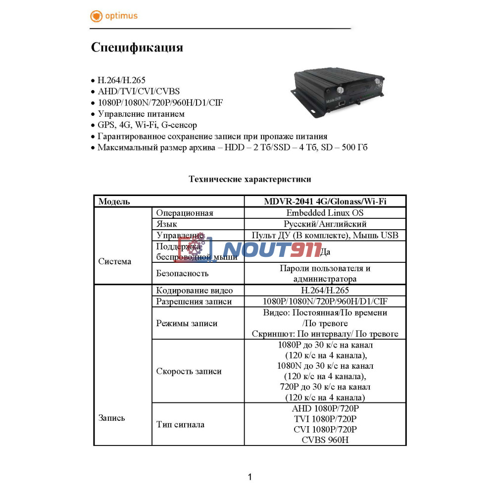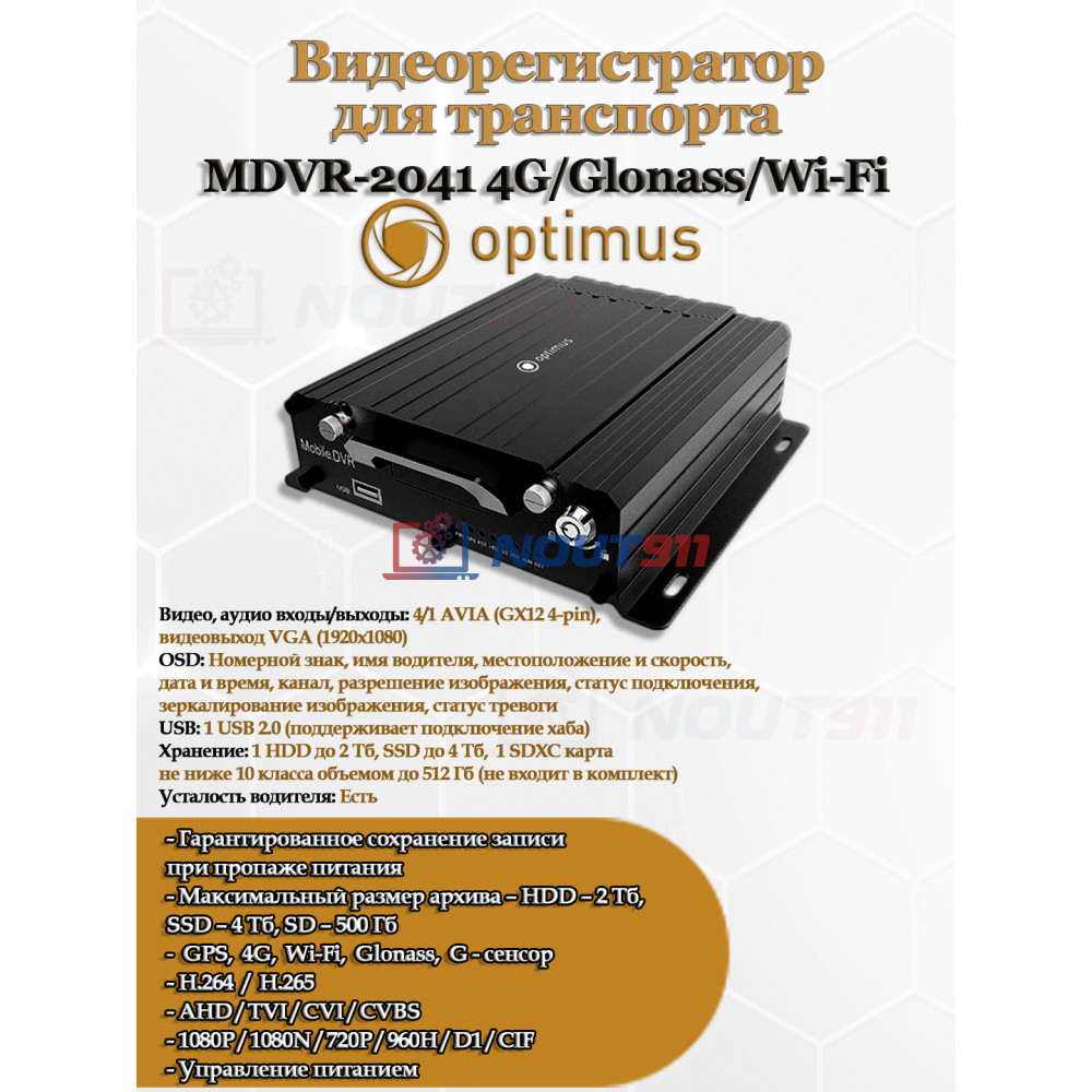 - Видеорегистратор Optimus MDVR-2041 с 4G/Glonass/Wi-Fi – 1 шт.