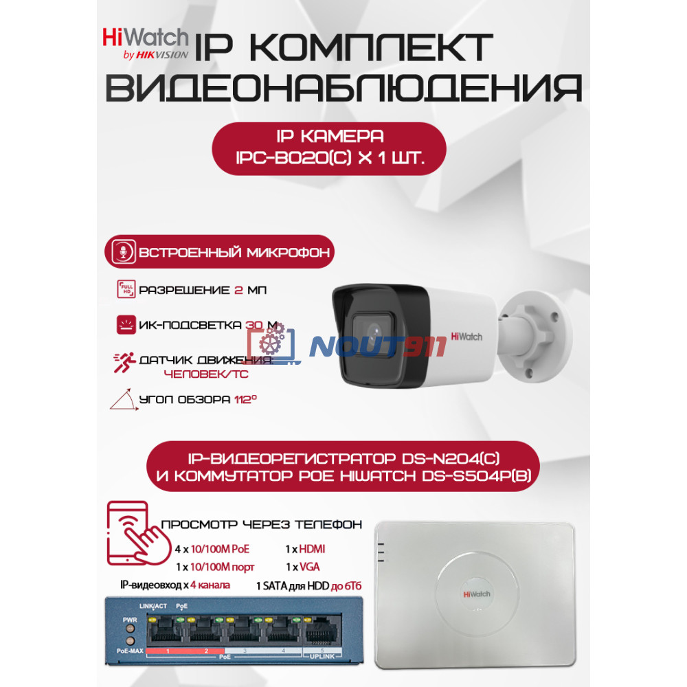 - Комплектация: видеокамера HiWatch IPC-B020(C), видеорегистратор HiWatch DS-N204(C), коммутатор HiWatch DS-S504P(B)