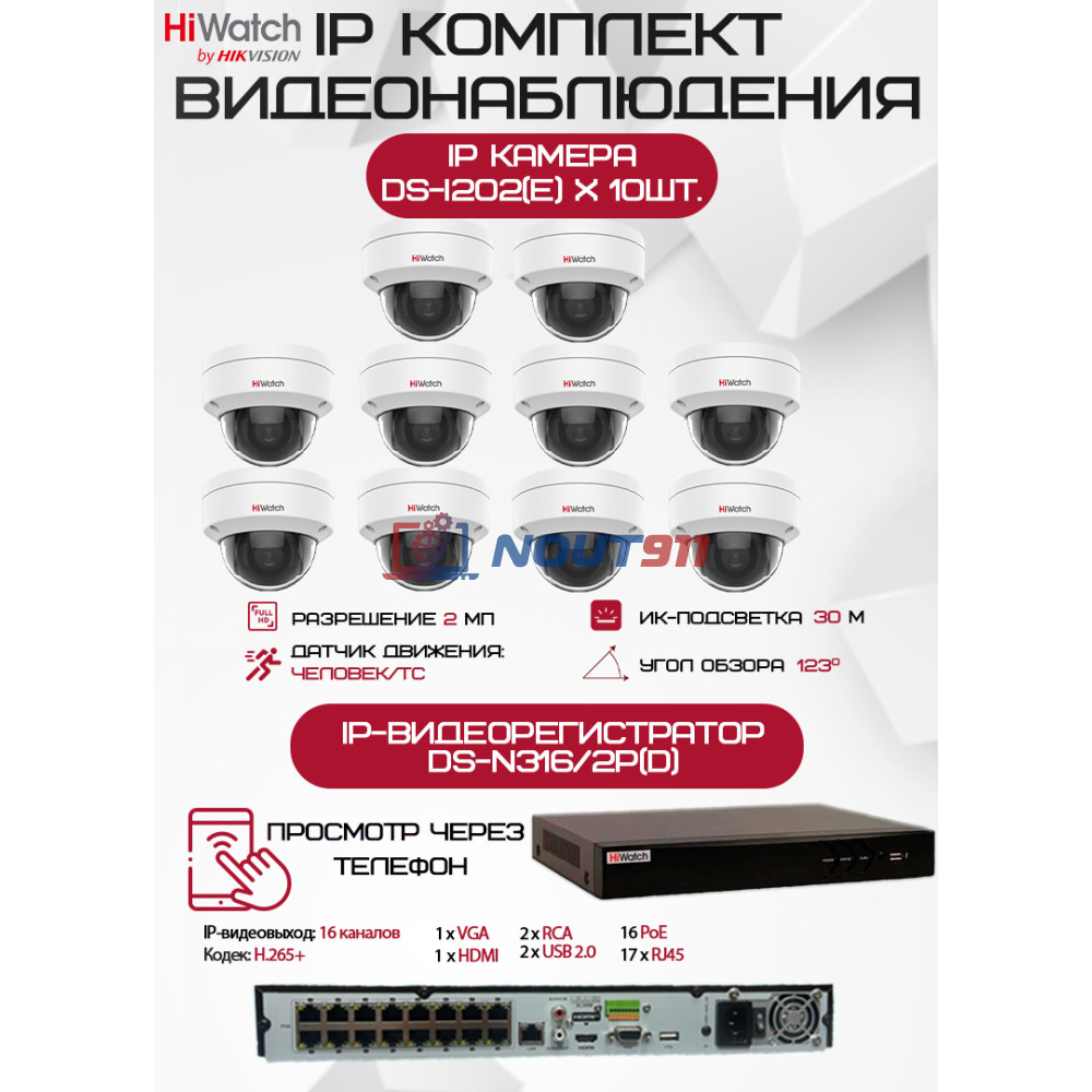 Комплект видеонаблюдения HiWatch на 10 IP камер - 2Мп 1080P