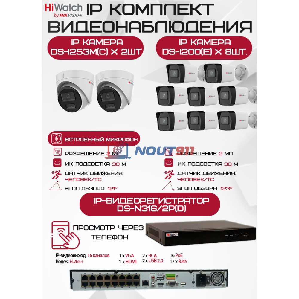 IP видеокамера HiWatch DS-I200(E) - 8 шт, IP видеокамера HiWatch DS-I253M(C) - 2 шт, Видеорегистратор HiWatch DS-N316/2P(D) - 1 шт