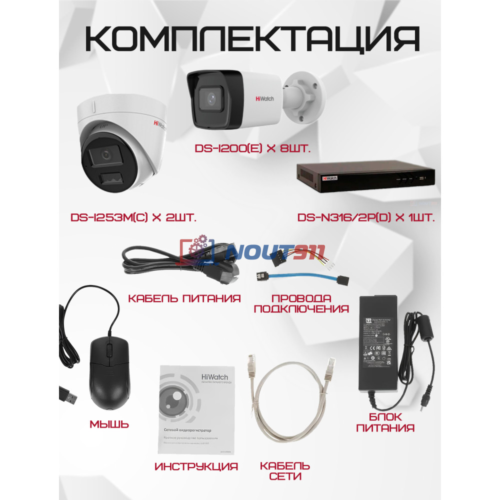 Составляющие комплекта видеонаблюдения HiWatch на 10 IP камер - 2Мп 1080P (DS-N316/2P(D) + 8xDS-I200(E) + 2хDS-I253M(C))