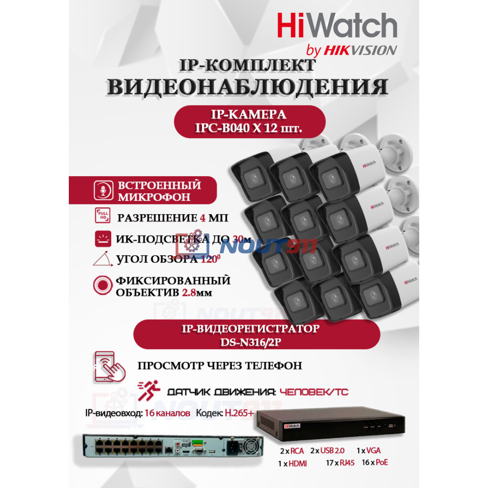 IP видеокамера HiWatch IPC-B040 - 12 шт, Видеорегистратор HiWatch DS-N316/2P(D) - 1 шт