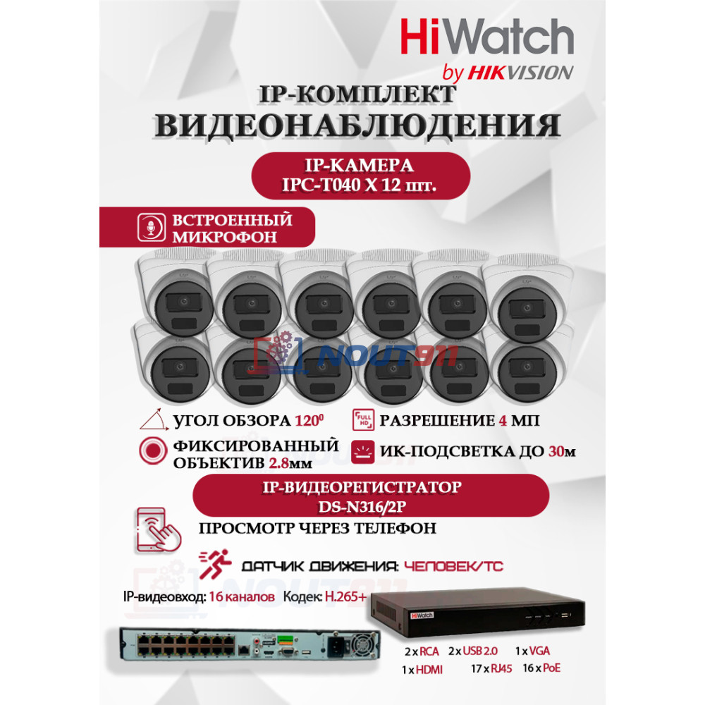 Комплект видеонаблюдения HiWatch на 12 IP камер - 4Мп 1440P
