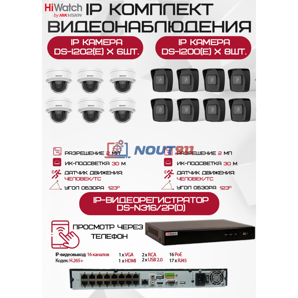 Комплект видеонаблюдения HiWatch (ХайВотч) на 14 IP камер - 2Мп 1080P (DS-N316/2P(D) + 8xDS-I200(E) + 6хDS-I202(E))