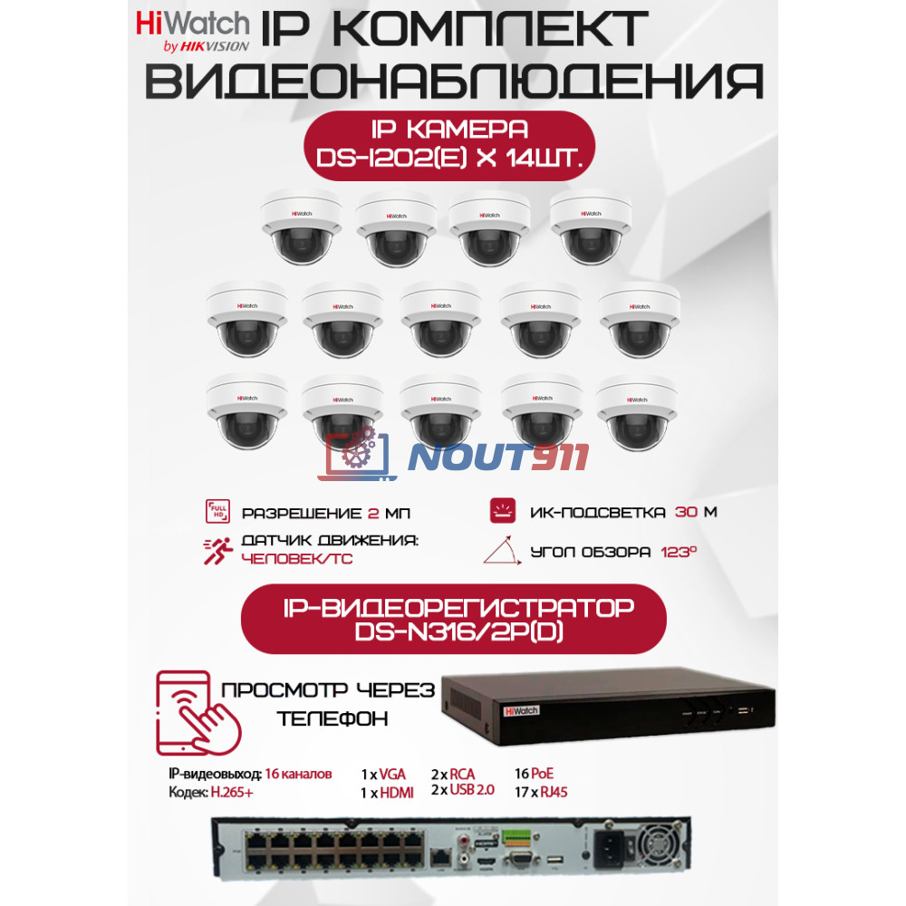 - 14 высококачественных IP видеокамер HiWatch DS-I202(E)