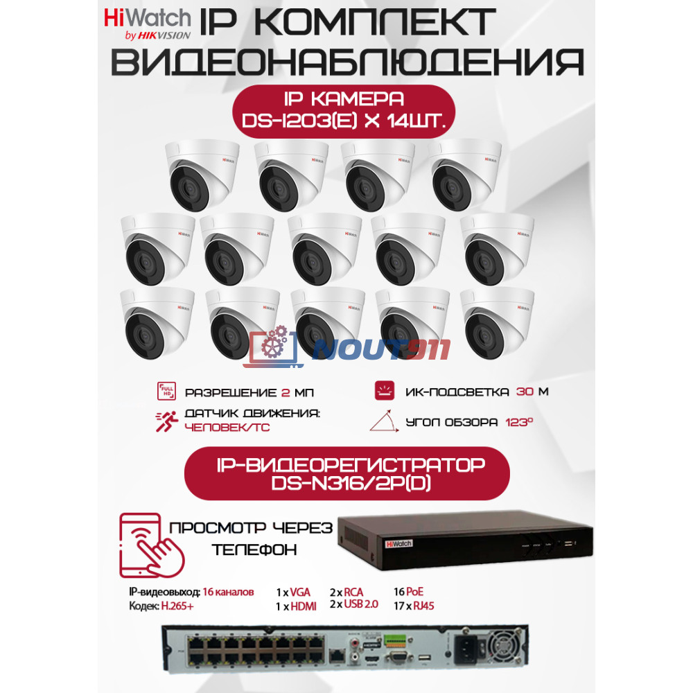 IP видеокамера HiWatch DS-I203(E) - 14 шт, Видеорегистратор HiWatch DS-N316/2P(D) - 1 шт