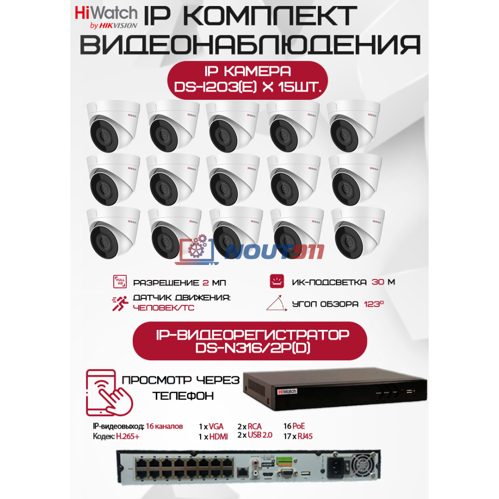 Комплект видеонаблюдения HiWatch на 15 IP камер - 2Мп 1080P