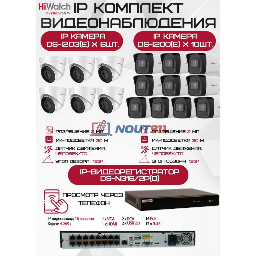 - Видеорегистратор: HiWatch DS-N316/2P(D) поддерживает подключение до 16 камер и HDD для хранения данных.