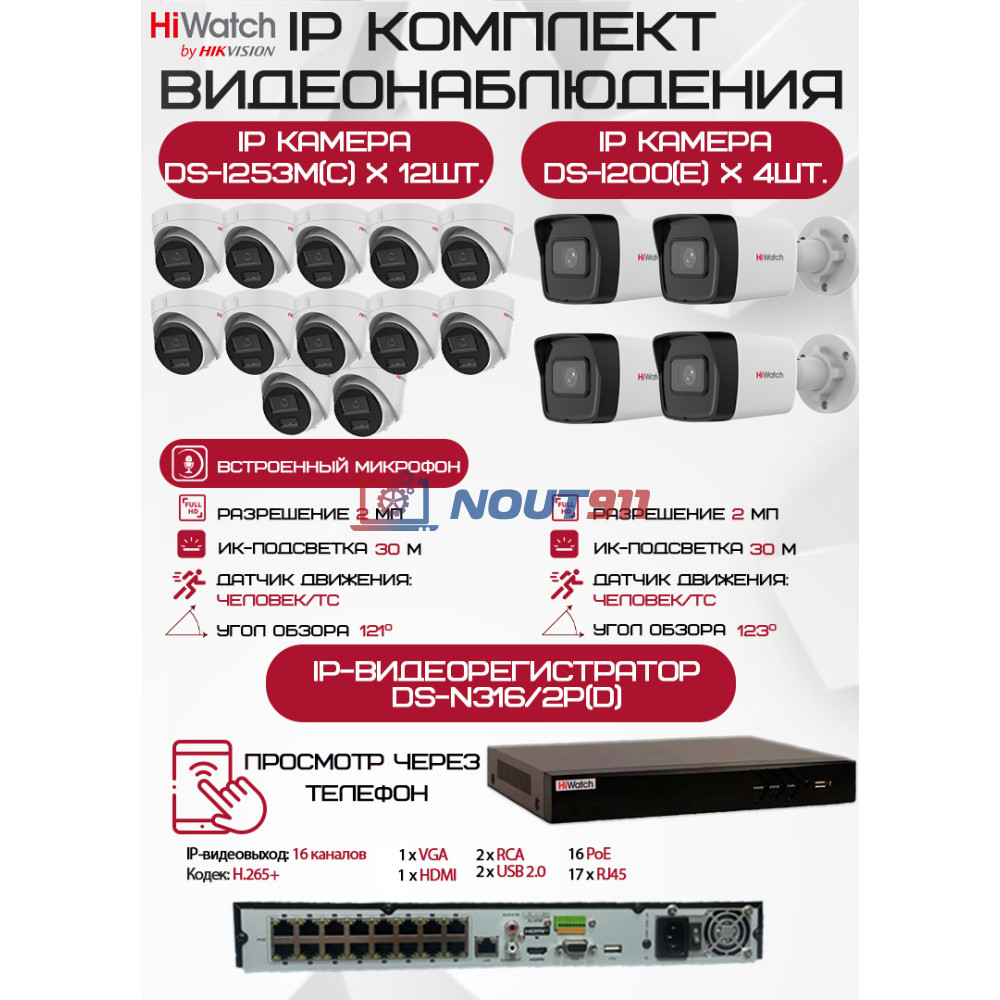 Комплект видеонаблюдения HiWatch на 16 IP камер - 2Мп 1080P