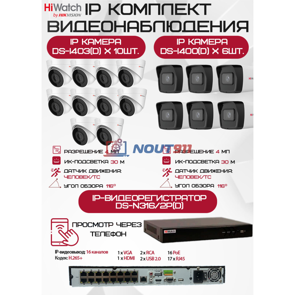 Комплект видеонаблюдения HiWatch (ХайВотч) на 16 IP камер - это передовая, надежная система для обеспечения безопасности вашего помещения. Данный комплект сочетает в себе высокотехнологичные камеры и мощный регистратор, что позволяет обеспечивать полную видеозащиту объектов как внутри, так и снаружи.