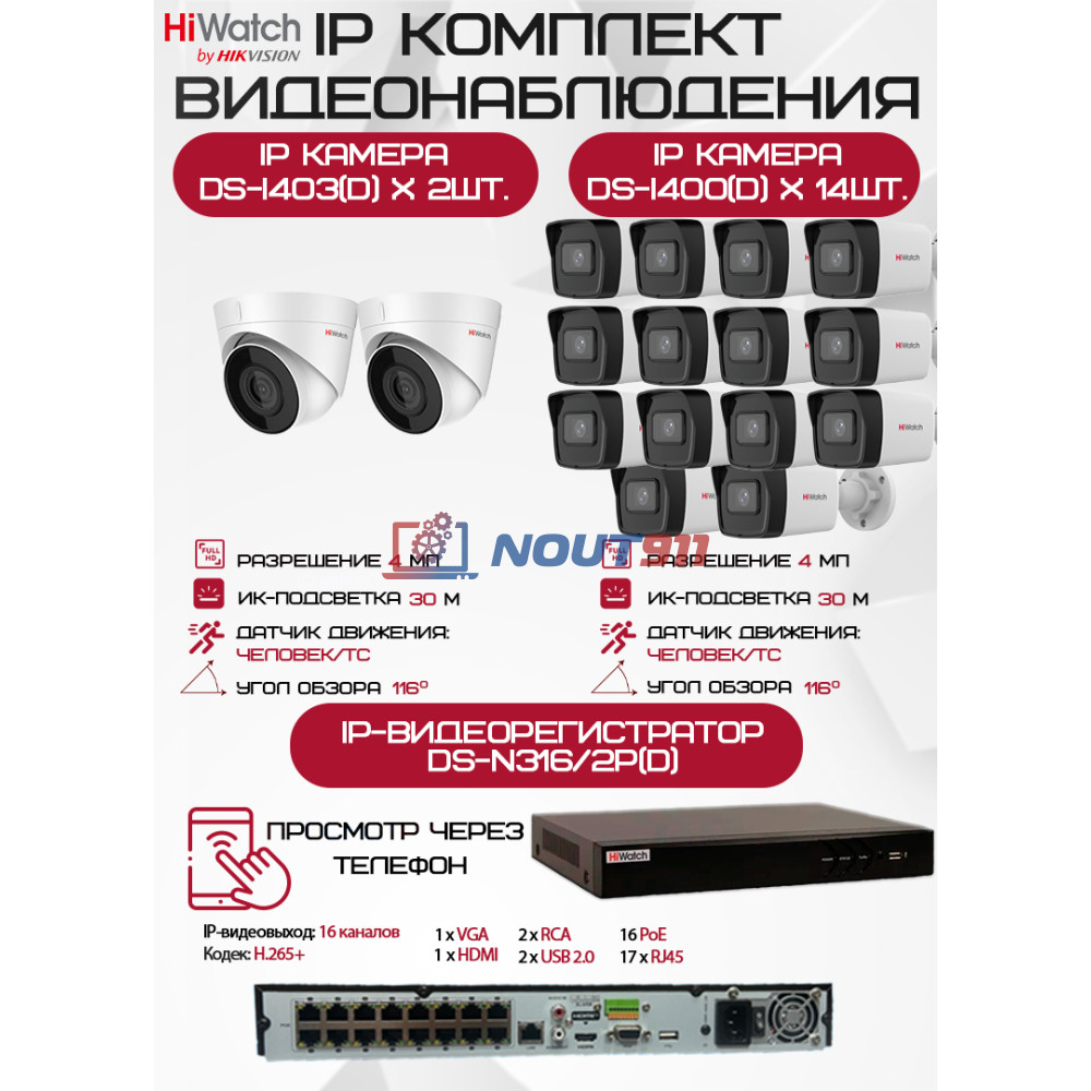 Комплект видеонаблюдения HiWatch на 16 IP камер - 4Мп 1440P