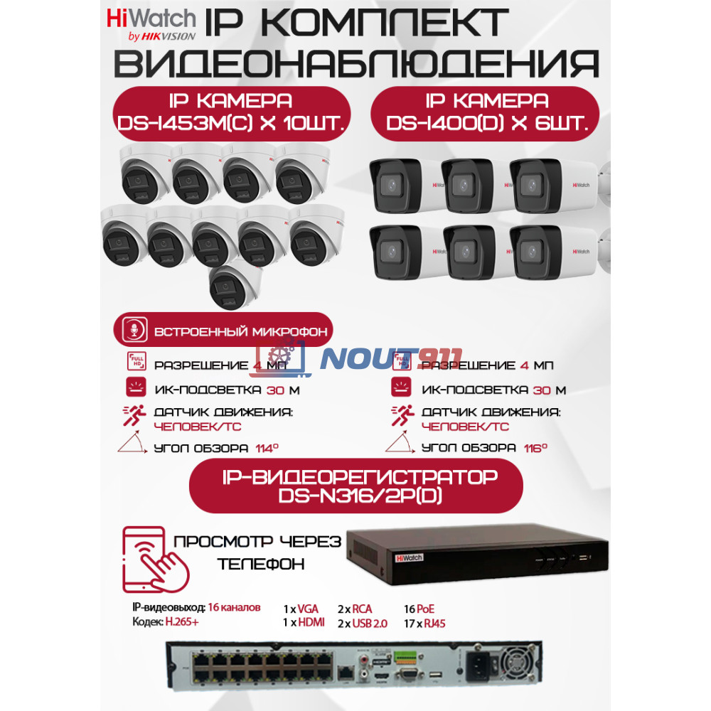 Комплект видеонаблюдения HiWatch на 16 IP камер - 4Мп 1440P