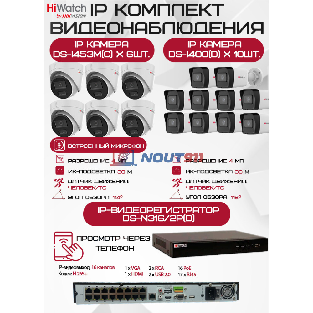 IP видеокамера HiWatch DS-I400(D) - 10 шт, IP видеокамера HiWatch DS-I453M(C) - 6 шт, Видеорегистратор HiWatch DS-N316/2P(D) - 1 шт