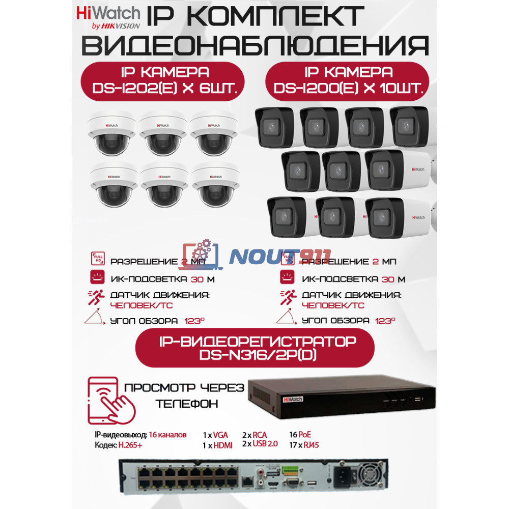 IP видеокамера HiWatch DS-I200(E) - 10 шт, IP видеокамера HiWatch DS-I202(E) - 6 шт, Видеорегистратор HiWatch DS-N316/2P(D) - 1 шт
