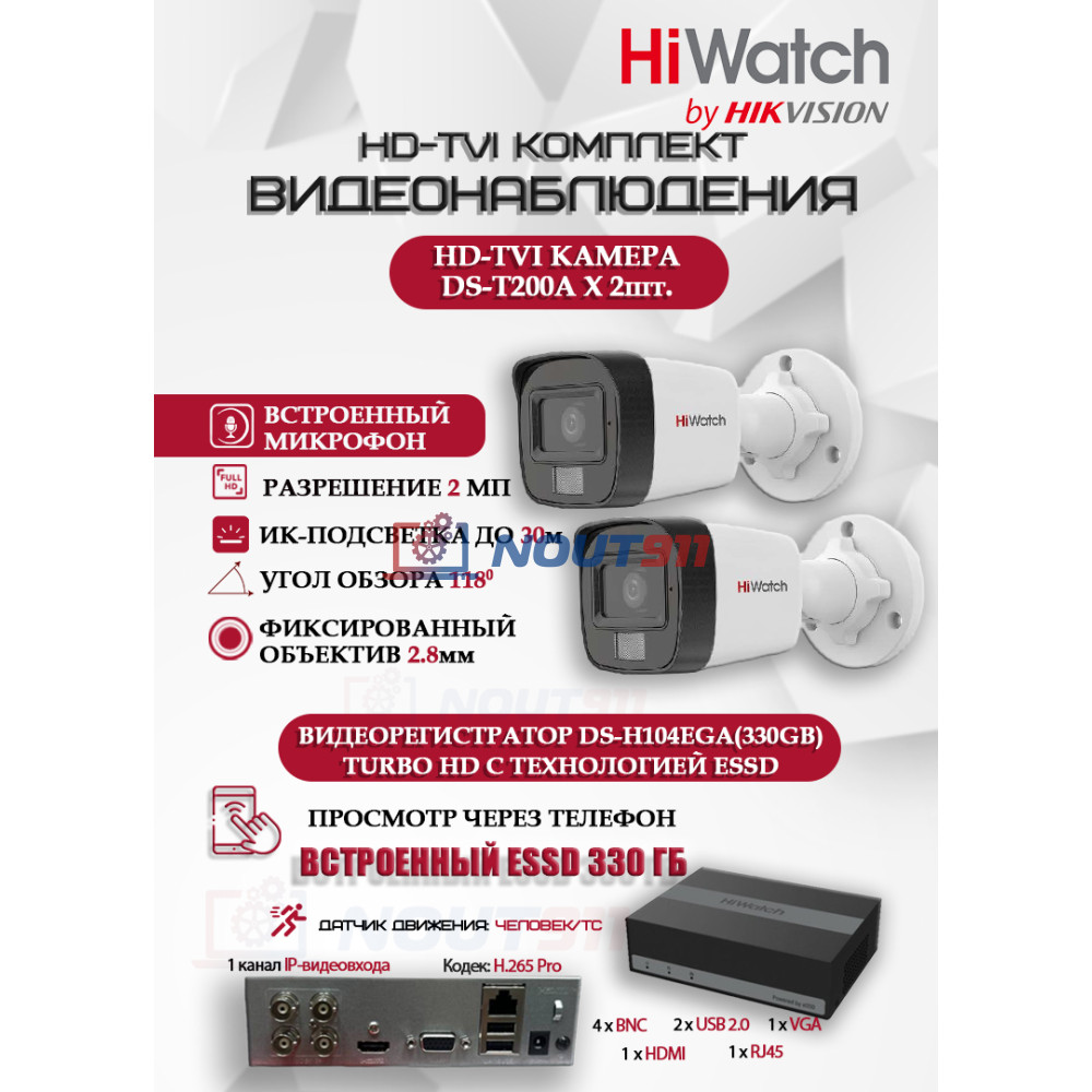 - Комплект включает: HD-TVI видеокамера HiWatch DS-T200A (2 шт), Видеорегистратор HiWatch DS-H104EGA(330GB) (1 шт)