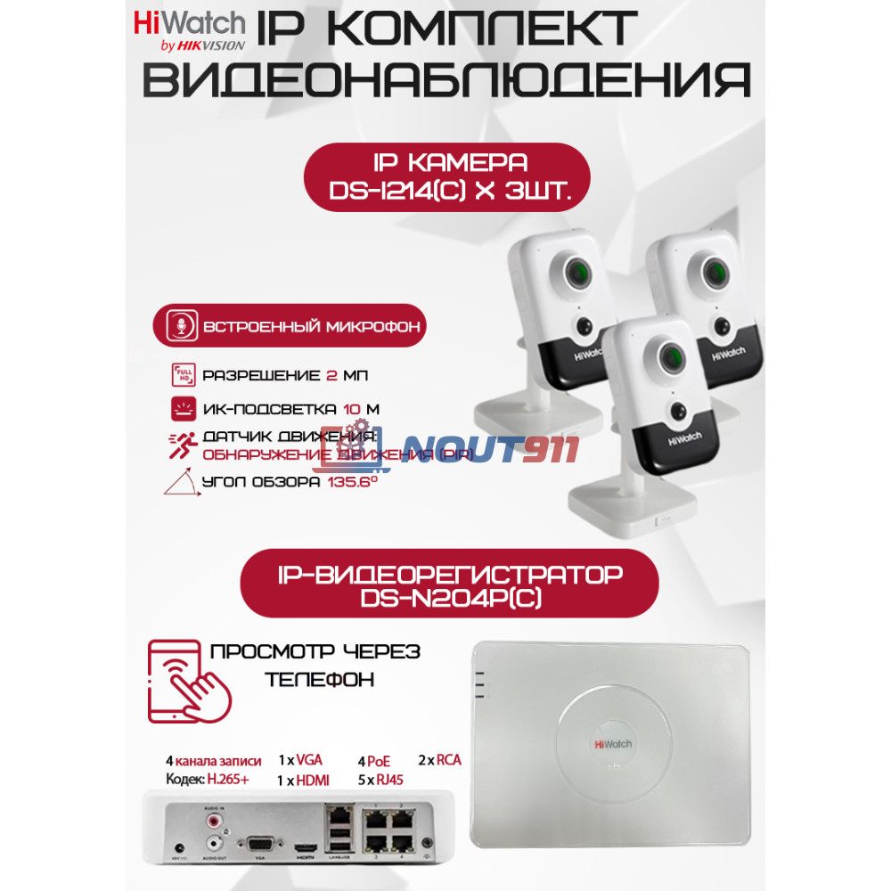 Комплект видеонаблюдения HiWatch на 3 IP камеры - 2Мп 1080P (DS-N204P(C) + 3хDS-I214(C))