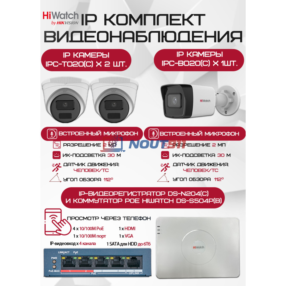 Комплект видеонаблюдения HiWatch на 3 IP камеры - 2Мп 1080p: Полный контроль и безопасность