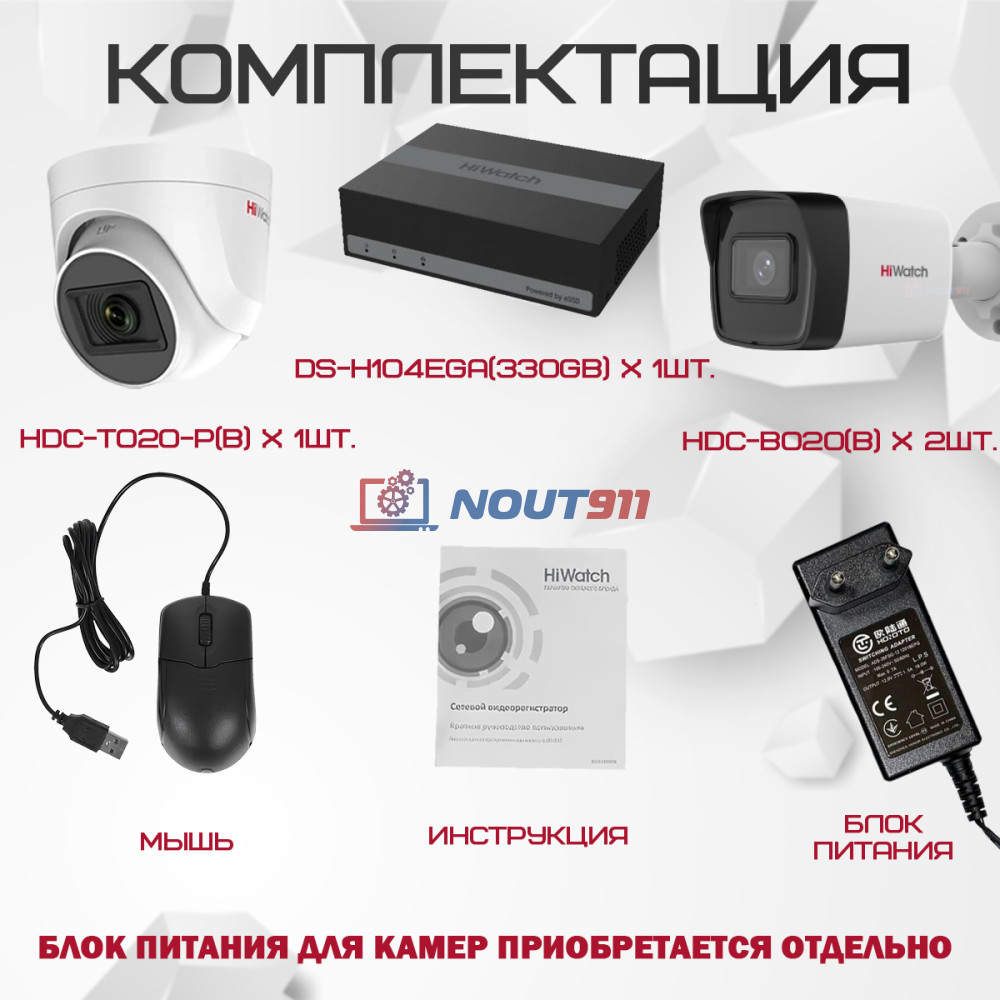- Комплектация: 2 уличные цилиндрические камеры HiWatch HDC-B020 и одна купольная внутренняя камера HiWatch HDC-T020-P с видеорегистратором HiWatch DS-H104EGA с встроенным накопителем на 330ГБ