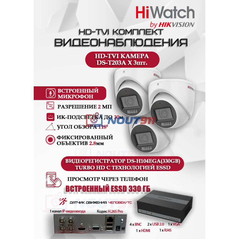HD-TVI видеокамера HiWatch DS-T203A - 3 шт, Видеорегистратор HiWatch DS-H104EGA(330GB) - 1 шт