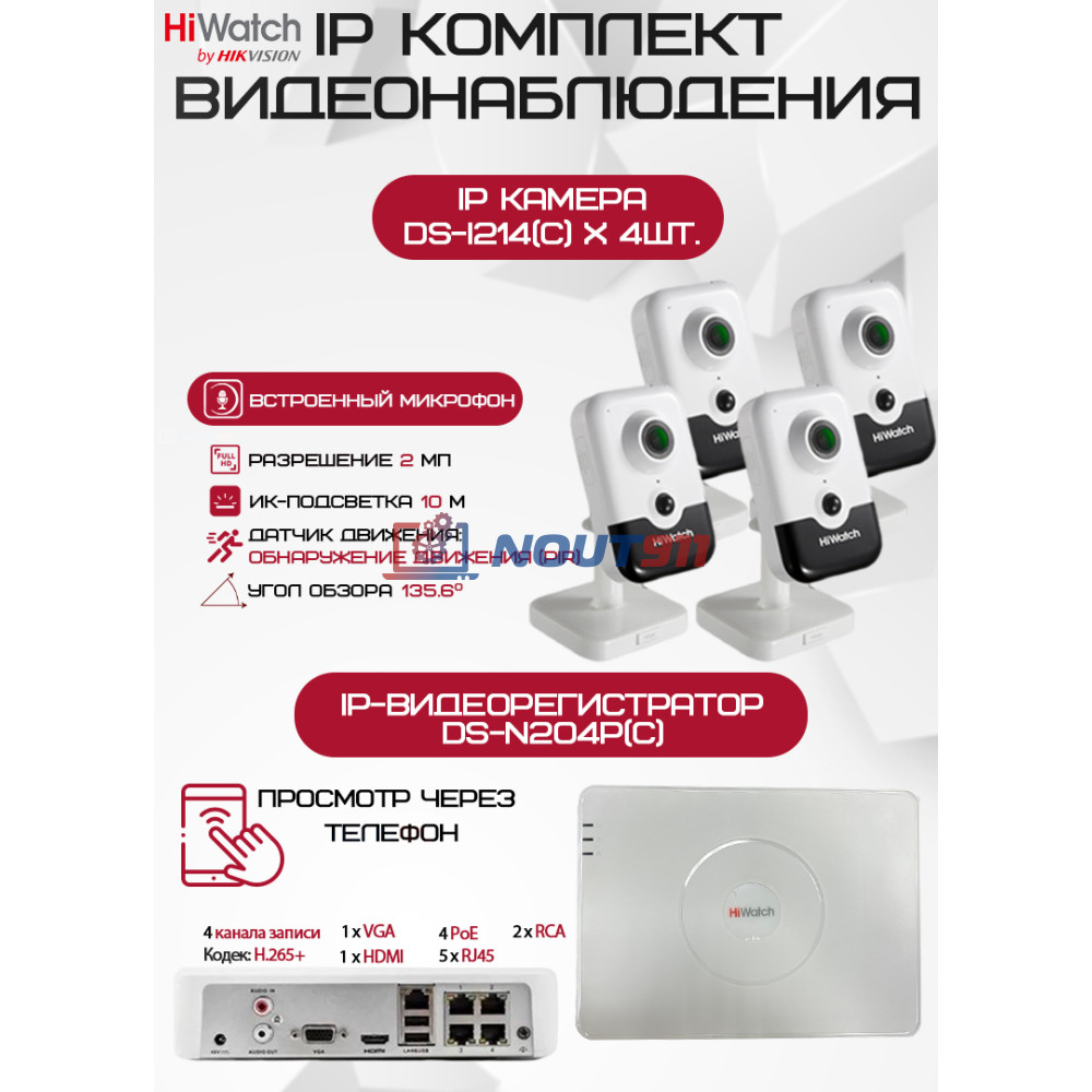 Комплект видеонаблюдения HiWatch на 4 IP камеры - 2Мп 1080P