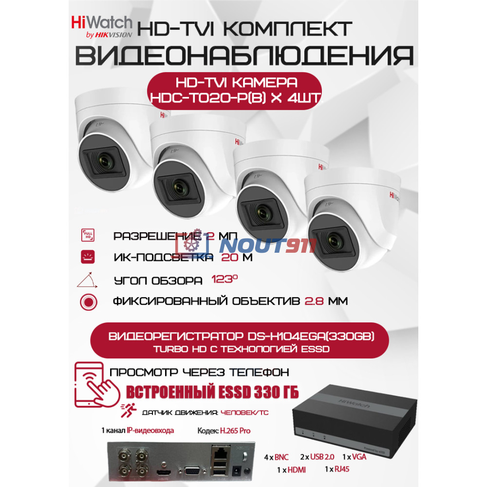 Тип устройства: Система видеонаблюдения из 4 HD-TVI камер. Видеокамеры HiWatch предлагают четкое и стабильно высокое качество изображения, ведущее к быстрой идентификации лиц и объектов.