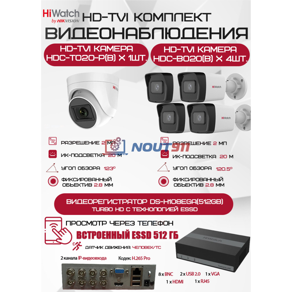Комплект видеонаблюдения HiWatch на 5 HD-TVI камер - 2МП 1080P