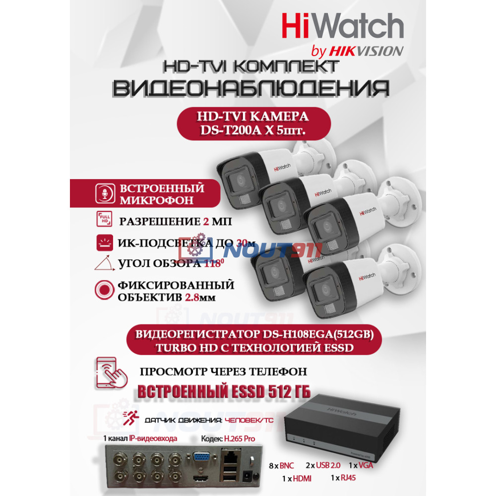 Составляющие комплекта видеонаблюдения HiWatch на 5 HD-TVI камер - 2МП 1080P (DS-H108EGA(512GB) + 5xDS-T200A)