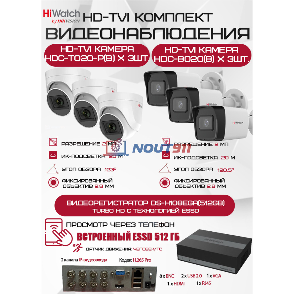 Комплект видеонаблюдения HiWatch на 6 HD-TVI камер - 2МП 1080P