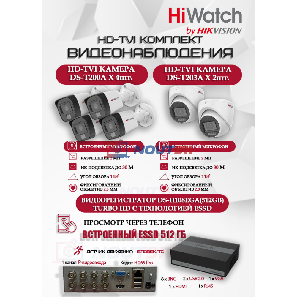 HD-TVI видеокамера HiWatch DS-T200A - 4 шт, HD-TVI видеокамера HiWatch DS-T203A - 2 шт, Видеорегистратор HiWatch DS-H108EGA(512GB) - 1 шт