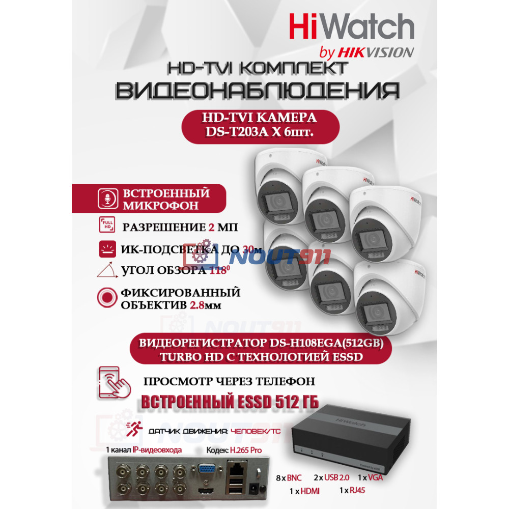 - Комплектация: Включает 6 белых купольных камер HiWatch DS-T203A и видеорегистратор HiWatch DS-H108EGA(512GB)