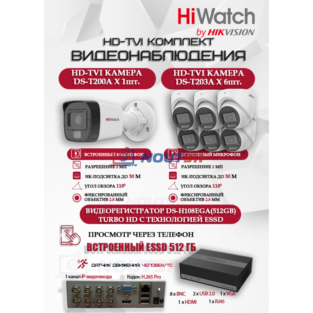 HD-TVI видеокамера HiWatch DS-T200A - 1 шт, HD-TVI видеокамера HiWatch DS-T203A - 6 шт, Видеорегистратор HiWatch DS-H108EGA(512GB) - 1 шт