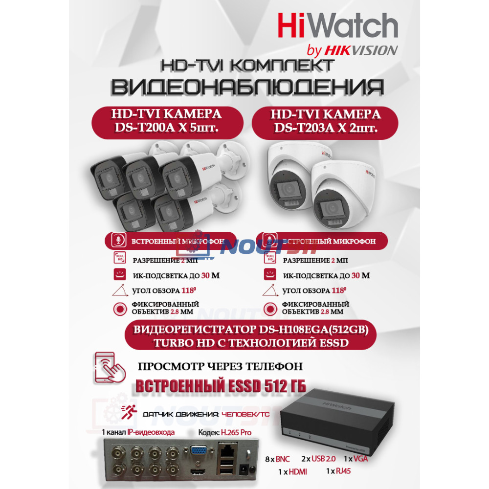- Комплектация: 5 уличных камер DS-T200A, 2 внутренних камер DS-T203A, видеорегистратор DS-H108EGA(512GB).