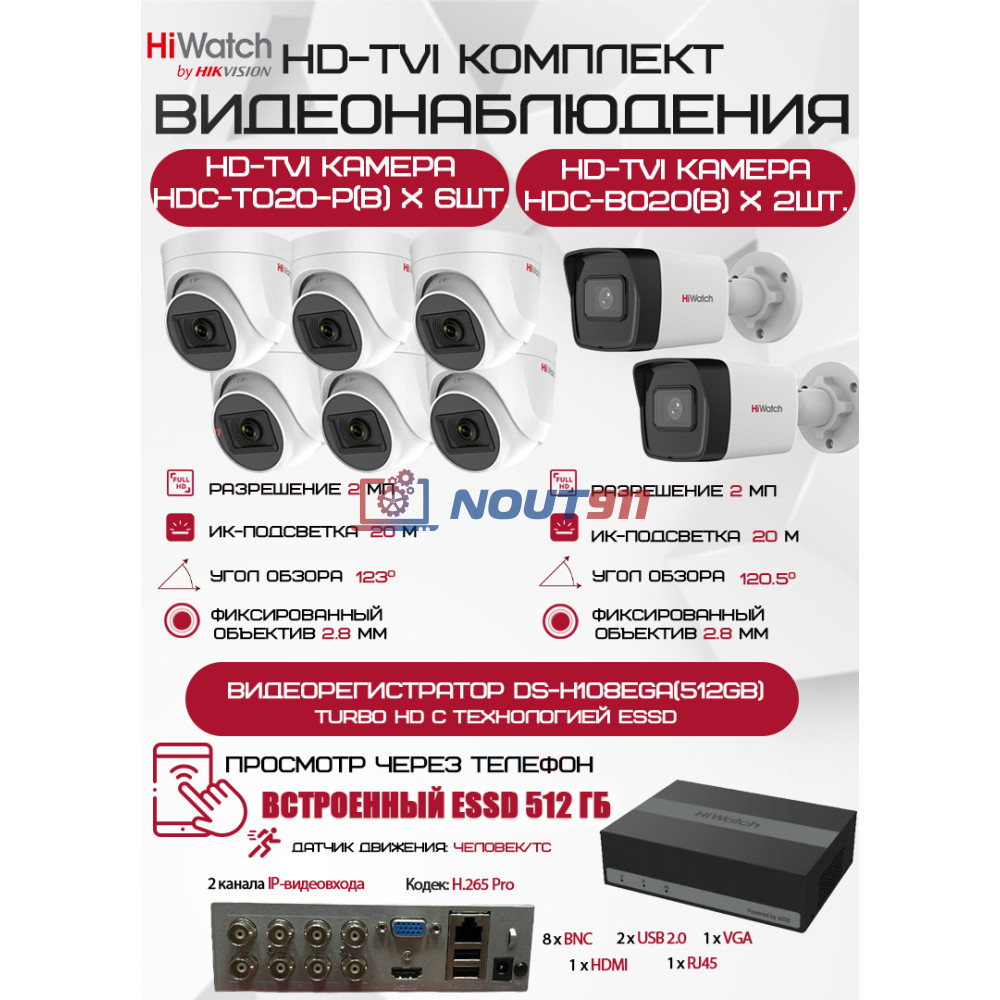 Комплект видеонаблюдения HiWatch на 8 HD-TVI камер - 2МП 1080P (DS-H108EGA(512GB) + 2xHDC-B020(B) + 6xHDC-T020-P(B))