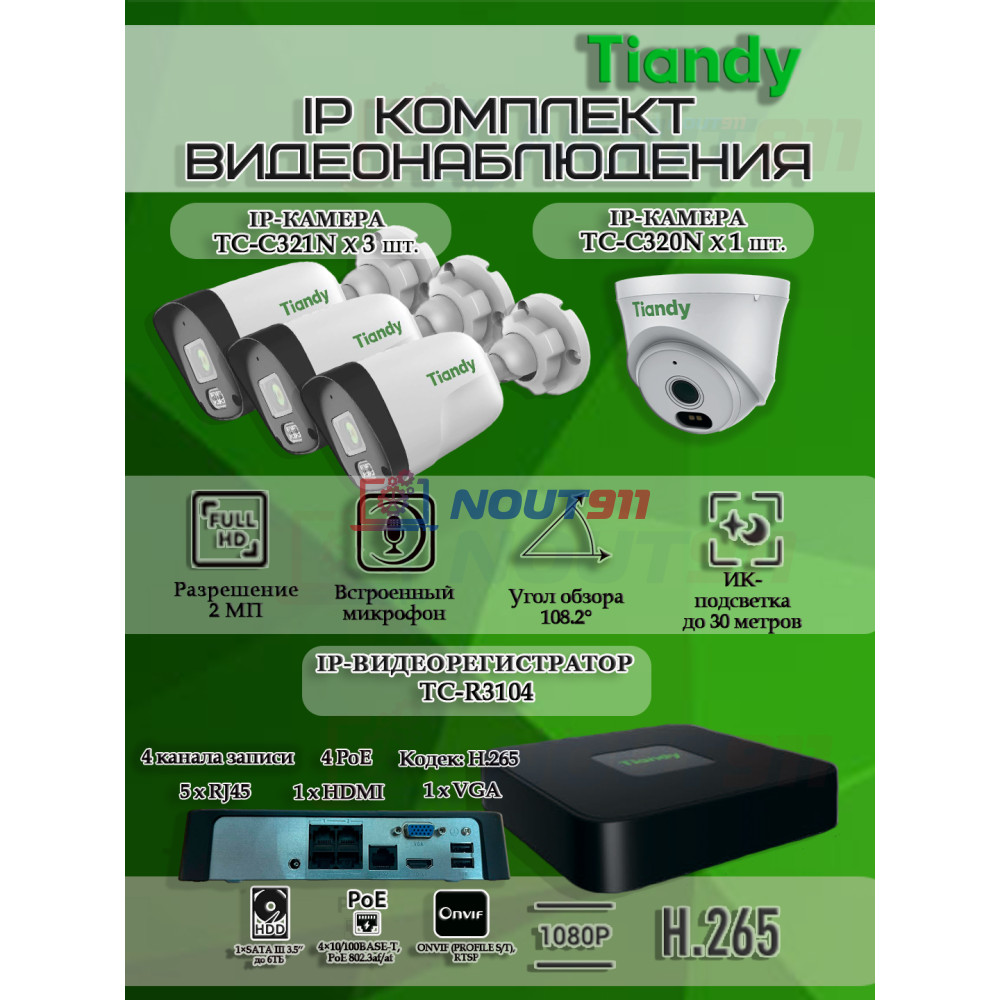 IP видеокамера Tiandy TC-C321N - 3 шт, IP видеокамера Tiandy TC-C320N - 1 шт, Видеорегистратор Tiandy TC-R3104- 1 шт.