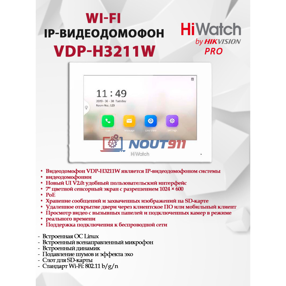 Описание продукта: Wi-Fi видеодомофон HiWatch Pro VDP-H3211W