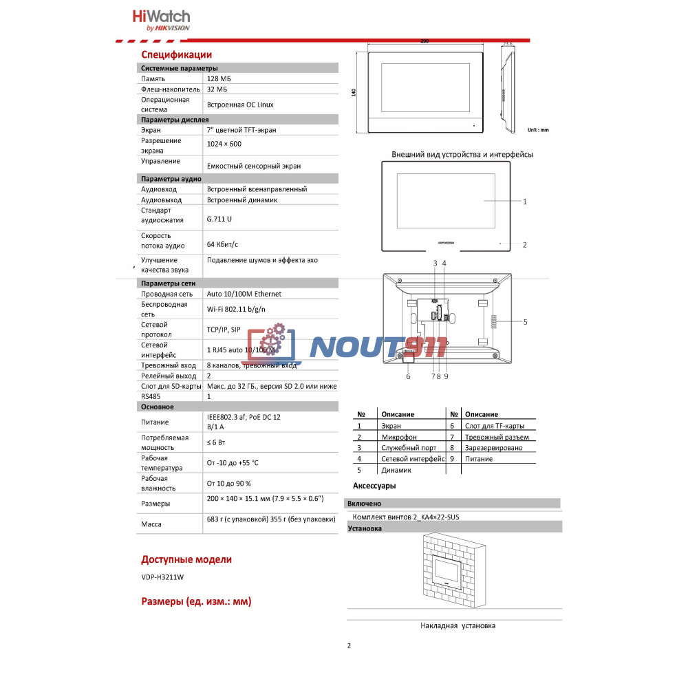 Благодаря настенному типу установки и сенсорному управлению, установить и настроить HiWatch Pro VDP-H3211W не составит труда. В комплект входят все необходимые аксессуары, включая инструкцию и крепежный комплект, что делает монтаж еще более удобным и быстрым.